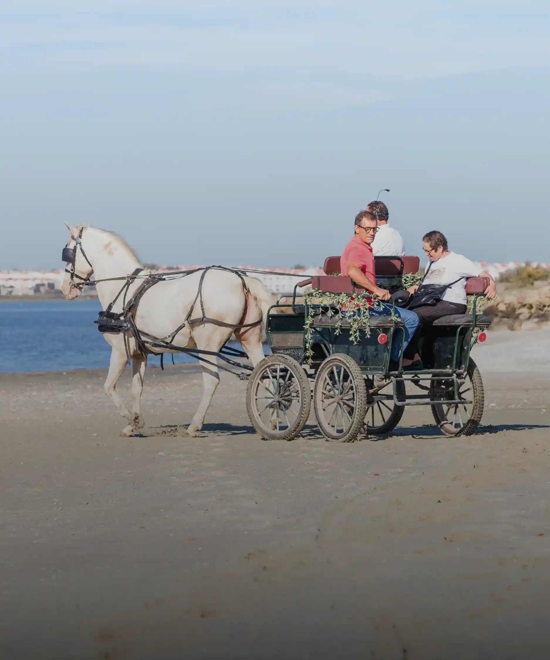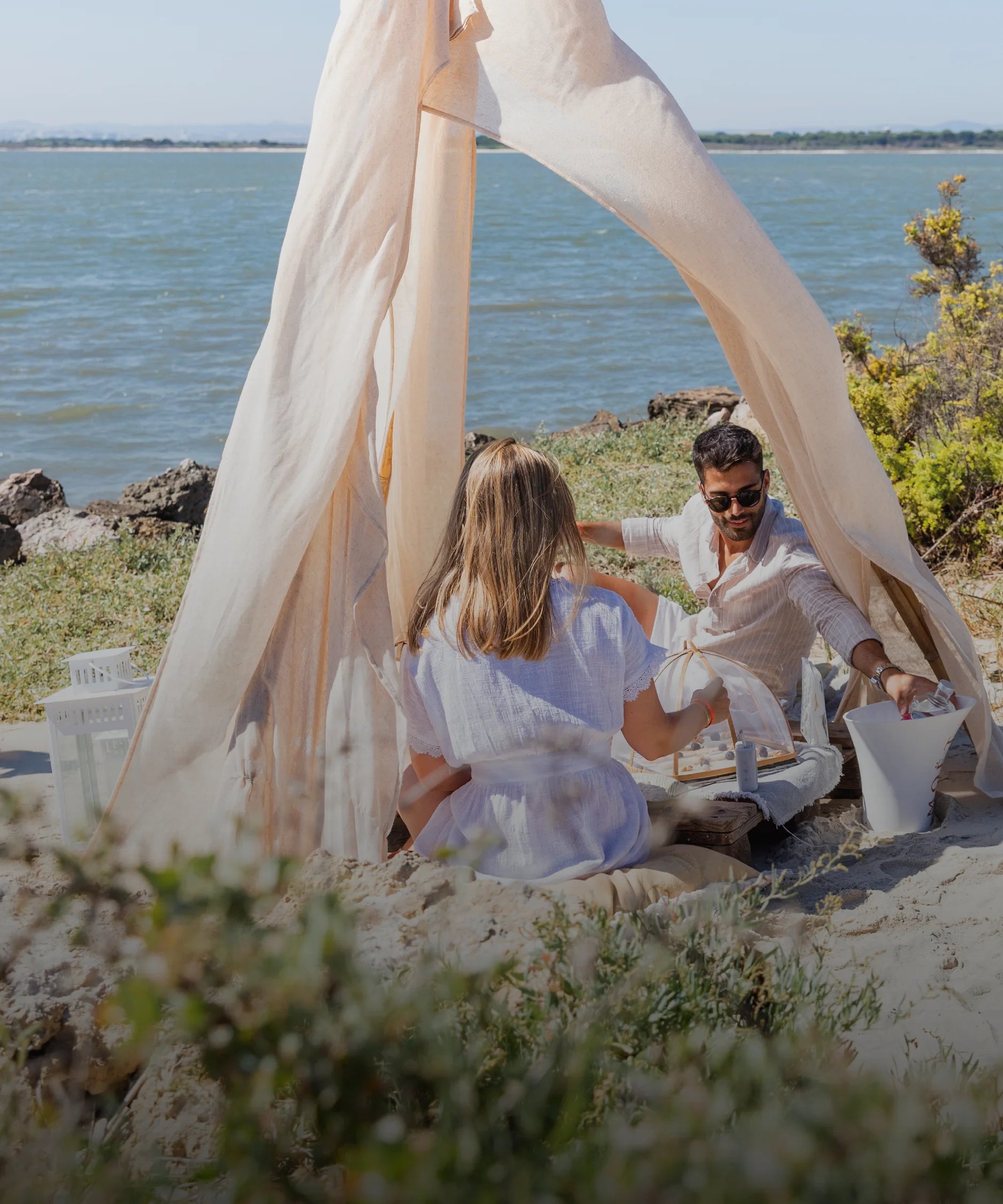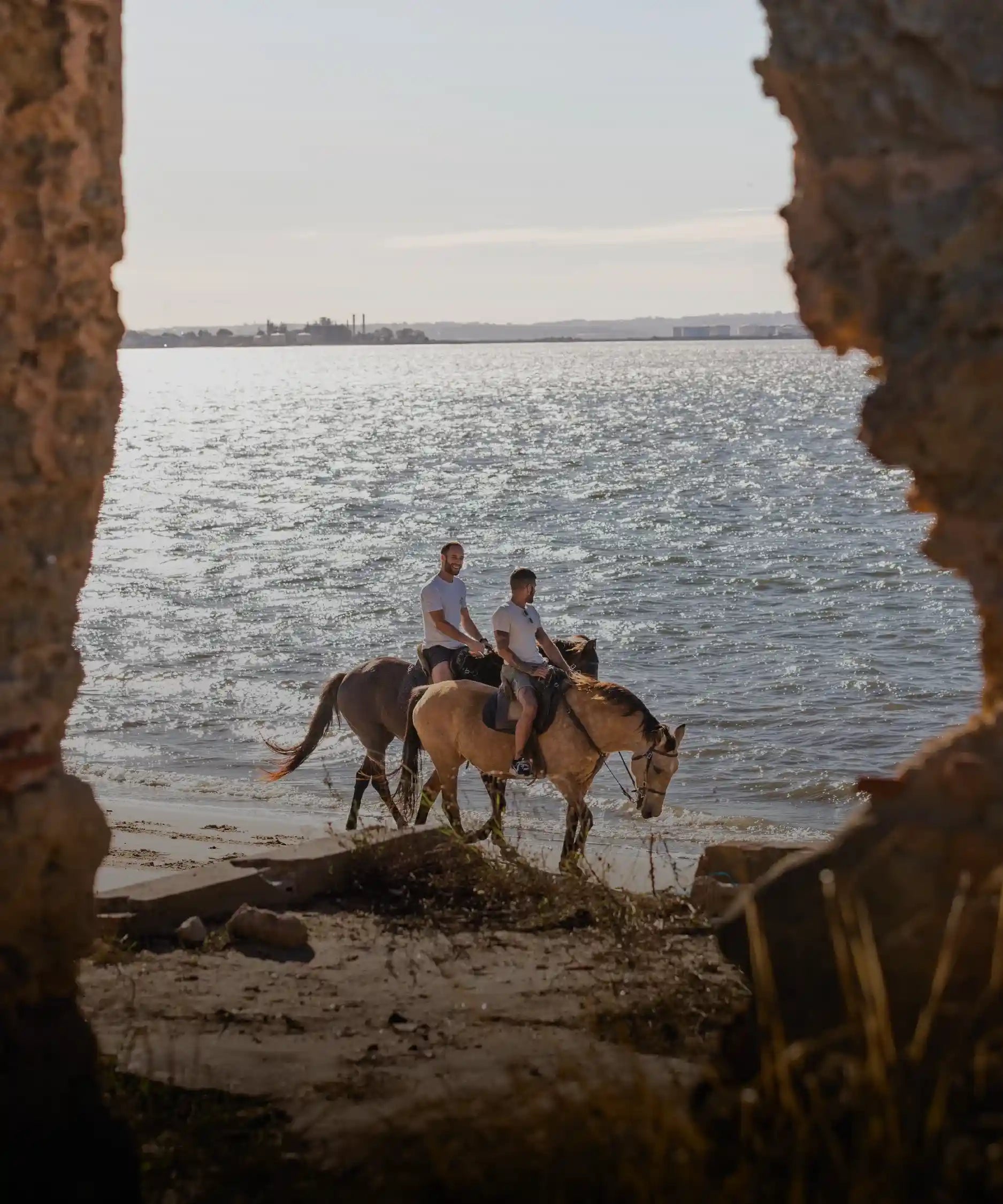 Depois do passeio e do pedido de casamento, retornamos a cavalo para o Pátio do Tejo. Aqui você pode desfrutar de um magnífico pôr do sol em uma praia com uma vista deslumbrante sobre Lisboa.